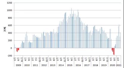 2.全年進口總量同比很難大幅增長。在鋼鐵行業(yè)利潤處于近年來較高水平的情況下,2021上半年我國鋼材進口量較2020上半年基本持平,較2020下半年大幅回落43%。2020年我國鋼材進口量激增始于6月份,6-11月單月進口量達到223萬噸,高基數(shù)效應下2021年我國鋼材進口量同比很難大幅增長。從影響因素來看,去年導致中國鋼材、鋼坯進口量大幅增長的主要因素均已悄然發(fā)生改變:一是,中國鋼鐵需求保持強勁,但海外供應缺口更為嚴峻;二是,國際鋼價隨著需求的復蘇漲幅明顯超過國內(nèi),進口資源成本顯著提升,去年階段性進出口價格倒掛已不復存在,上述變化均不利于國內(nèi)鋼材進口保持高速增長。