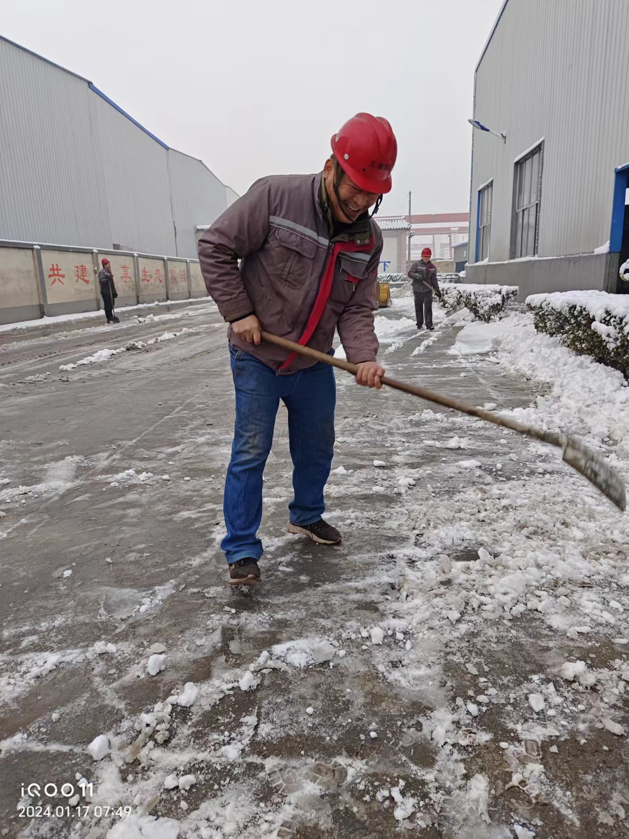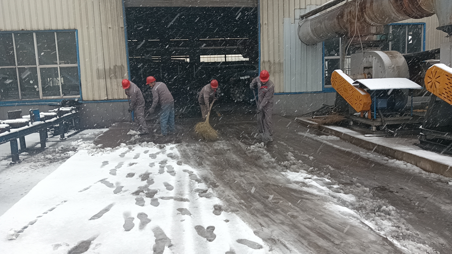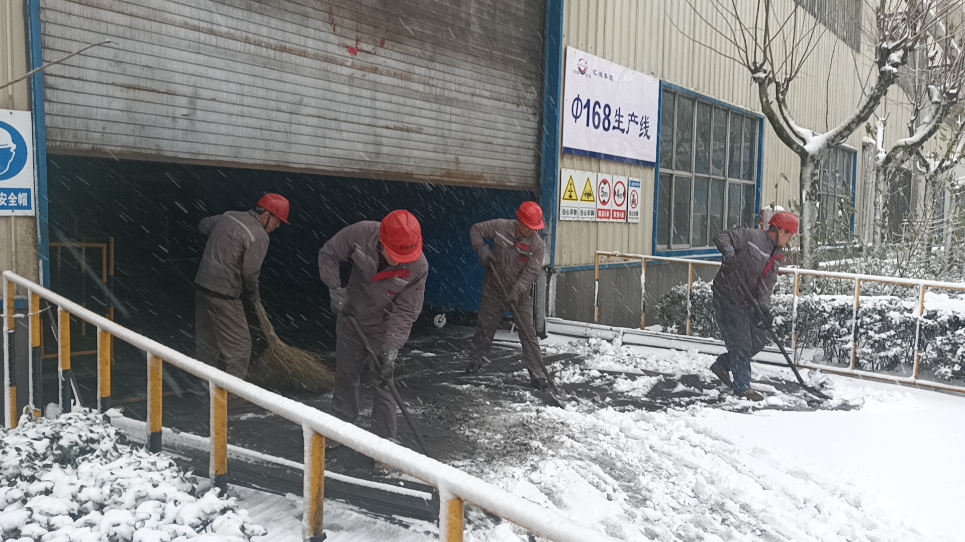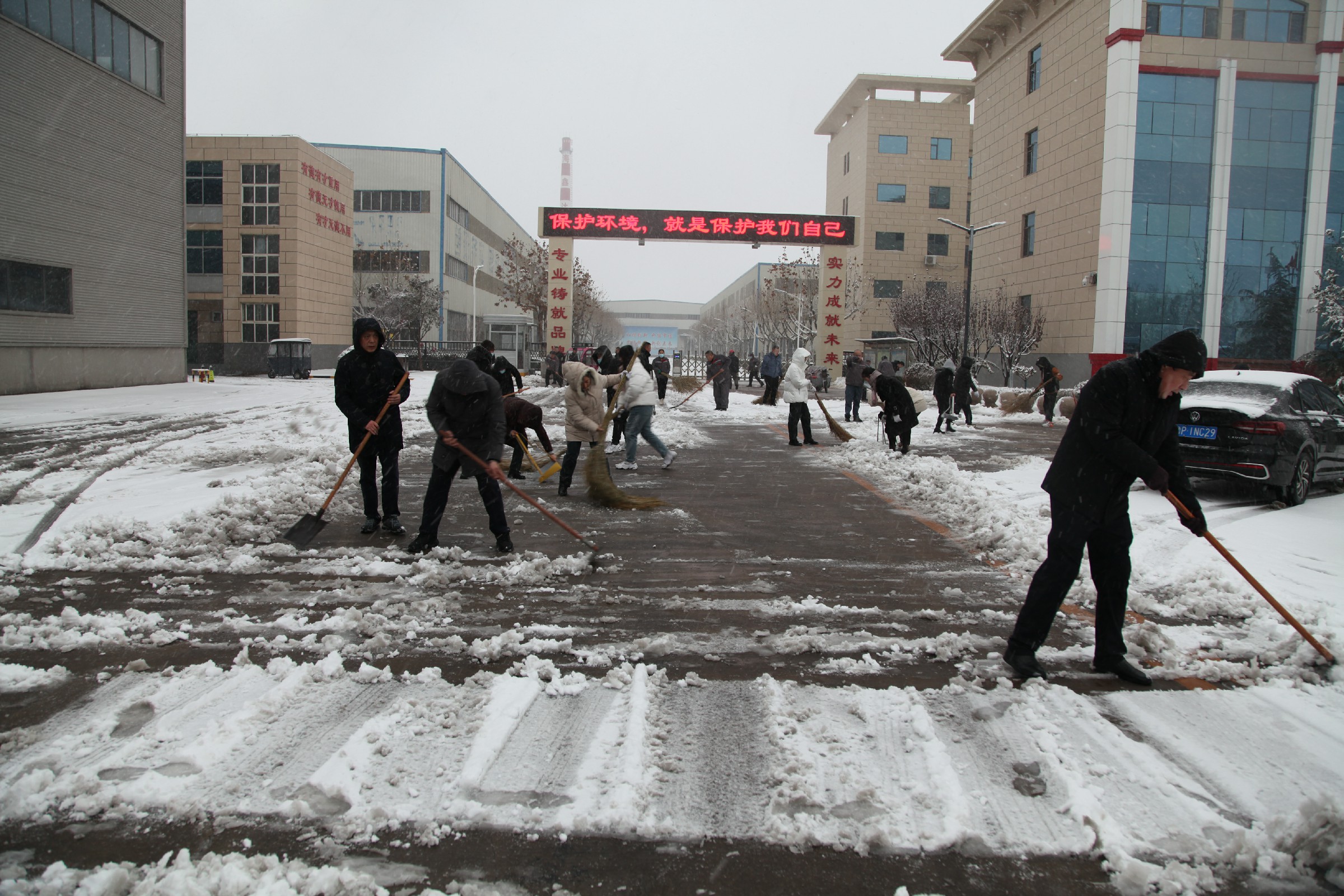 浴“雪”奮戰,不畏嚴寒!各部門、各分廠快速響應,積極組織,人員迅速到位。在集團董事長賀懷芝的帶領下,全體干部職工組成多個掃雪小組,頂著嚴寒,揮舞著鐵鍬對辦公大樓周圍廣場、主干道以及園區外主干道的冰雪進行了清掃。各分廠負責各廠周邊區域,利用換班時間進行清掃。大家齊心協力,配合默契,呼出的白霧、揮動的掃把、忙碌的身影,在皚皚白雪的映襯下,構成一道道靚麗的風景!熱火朝天的干勁兒在嚴寒冬日里散發著溫暖與熱情!冰雪雖厚,擋不住眾志成城;天寒地凍,敵不過勠力同心!經過一個多小時的奮戰,終于將積雪全部鏟除,為員工通行、貨物進出開辟了一條洋溢著溫情的通暢之路。